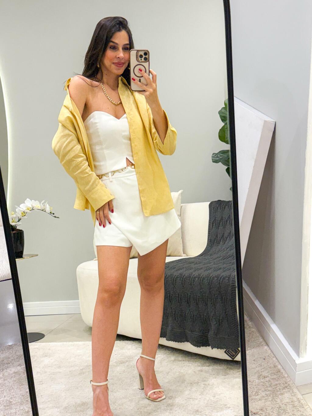 Um clássico repaginado com detalhes que fazem a diferença. O Shorts Saia Olivía traz a elegância do corte em alfaiataria com a praticidade do shorts e o charme da saia frontal. O destaque fica por conta da barra assimétrica, que adiciona um toque moderno e diferenciado à peça.